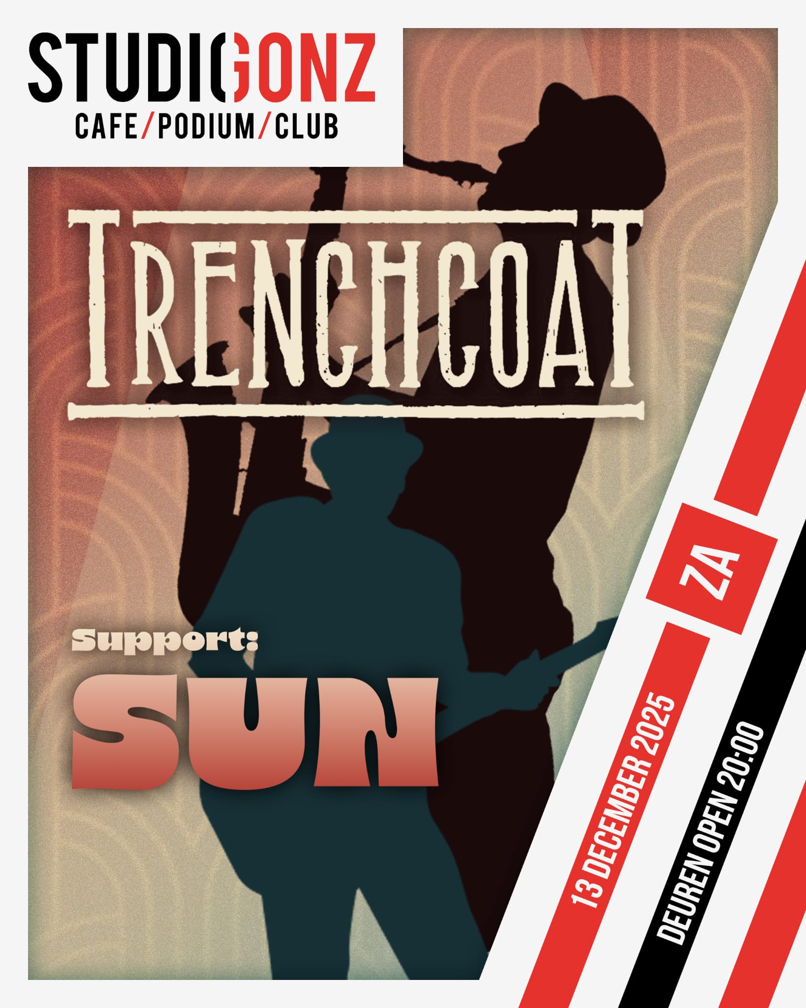 Tijd voor een feestje, Trenchcoat keert terug naar StudioGonz! Verwacht spetterende en stampende Heavy-Swing, Jazz en Rock 'n Roll van deze 9 koppige band die van elk optreden weer een ware feestavond weet te maken. Support SUN brengt met inspiratie uit de 70s en 80s moderne pop, rock en funk samen in een zomerse blend.