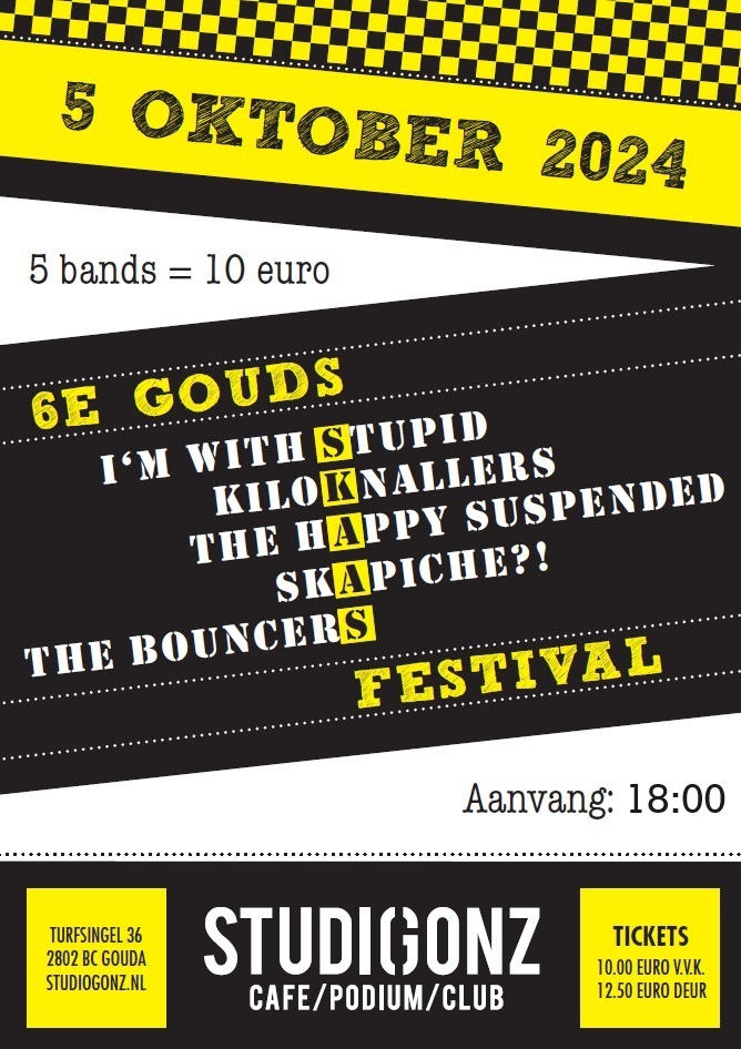 Save the Date! Gouds SKAasfestival #6 vindt plaats op zaterdag 5 oktober 2024! Met I'm With Stupid, Kiloknallers, The Happy Suspended, Skapiche?! en The Bouncers.