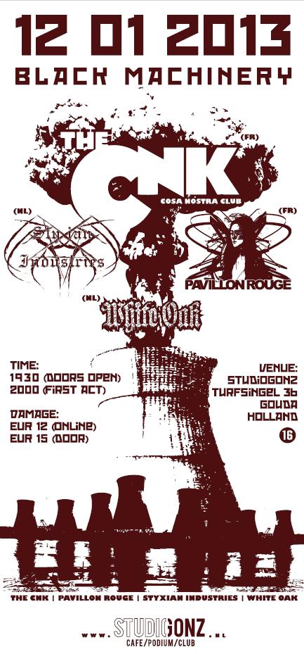 Black Machinery presents a toxic mix of Black and Industrial Metal. With the the French cult act The CNK and Pavillon Rouge preforming for the first time in the Netherlands. With: The CNK, Pavillon Rouge, Styxian Industries and White Oak.